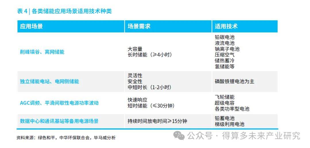 在推动技术规模化应用过程中,需要针对不同的应用场景,筛选出能够满足电网高安全性、大规模、长寿命、低成本、高效率等需求的主流技术(表4)。从场景适用性角度分析,除了电化学储能技术的市场前景值得关注外,压缩空气储能、飞轮储能、氢(氨)储能等的商业化潜力同样不容小觑。例如,压缩空气储能被视为抽水蓄能的最佳替代品,两者同属于机械储能,具备容量大、寿命长等优点,而压缩空气储能选址条件更宽松,对生态环境影响更小,适用于电网削峰填谷、集中式可再生能源并网等大容量长时储能场景。飞轮储能瞬时功率大,具有毫秒级响应速度和分钟级放电时间,更适合电网调频、改善电能质量等高频短时场景。此外,氢(氨)储能近来愈发受到关注,原理是利用“电-氢-电”的互变性实现能量存储和释放,具有清洁低碳、存储时间长、运输距离远等优势,在大规模长距离能量储运场景中优势明显。