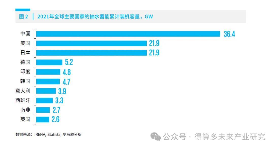 从组成结构来看,抽水蓄能电站在普通水力发电站的基础上增设了实现下水库到上水库输水的管道和相应的水泵系统,其犹如一个大型清洁能源“蓄电池”,在无过多燃料消耗的同时,有效地提高了电网的安全性、经济性和可靠性。同时,抽水蓄能具有技术成熟、储能容量大、系统效率高、运行寿命长、安全性能高等优势,是当前商业化程度较高、应用范围较广的主流储能技术1,2。从国际市场来看,抽水储能占据绝对领先地位,截至2020年底,抽水蓄能装机规模占电力储能项目总规模的94%3。其中,中国已基本形成关于抽水蓄能的全产业链发展体系和专业化发展模式。据IRENA统计,截至2021年12月底,我国抽水蓄能累计装机容量已达36.4GW,同比增长15.6%,已建和在建规模位列世界首位。美国和日本分别位列第二和第三,累计装机容量约达21.9GW,德国、印度、韩国等国家也在抽水蓄能领域有诸多实践,累计装机容量均达4.7GW以上(图2)。